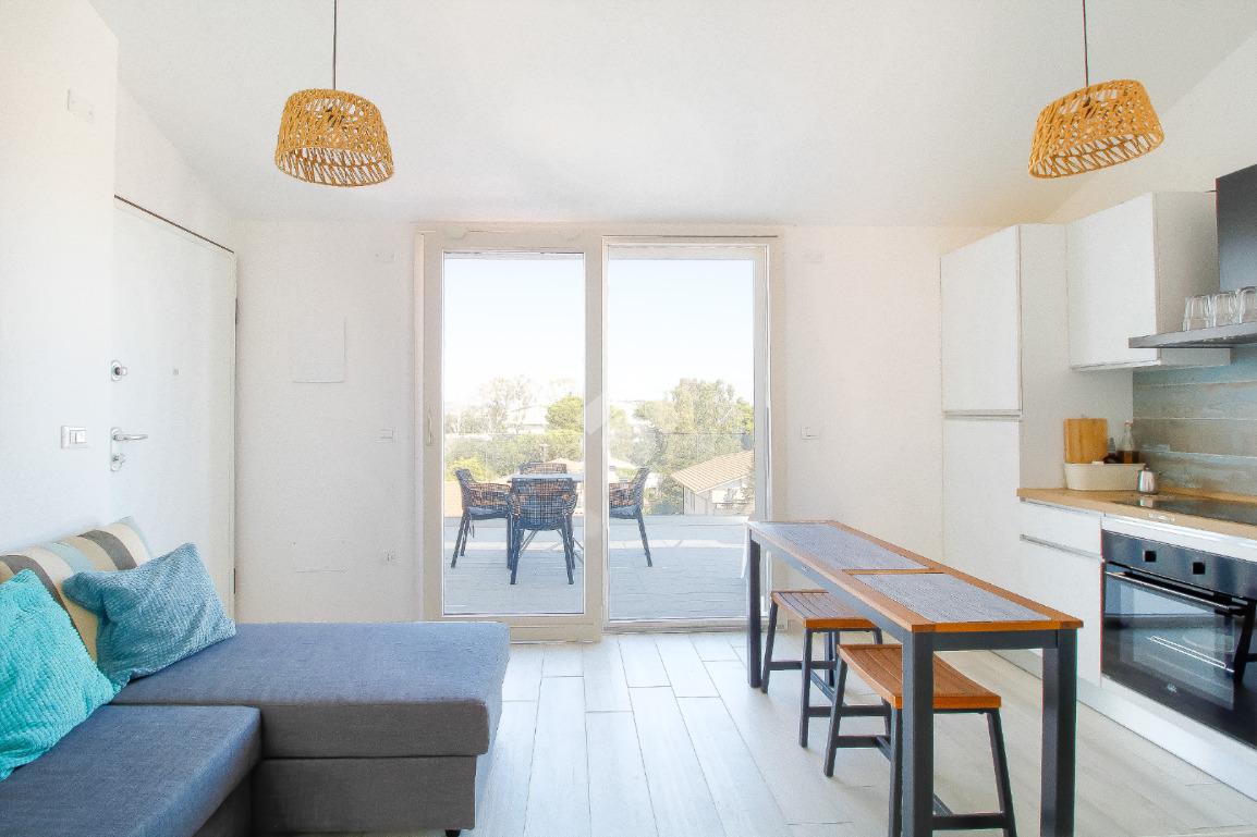 L’ingresso si apre su un soggiorno con cucina a vista, ambiente accogliente e funzionale, da cui si accede tramite una porta finestra al terrazzo abitabile con una mozzafiato vista sul mare, perfetto per momenti di relax o pranzi all’aperto.