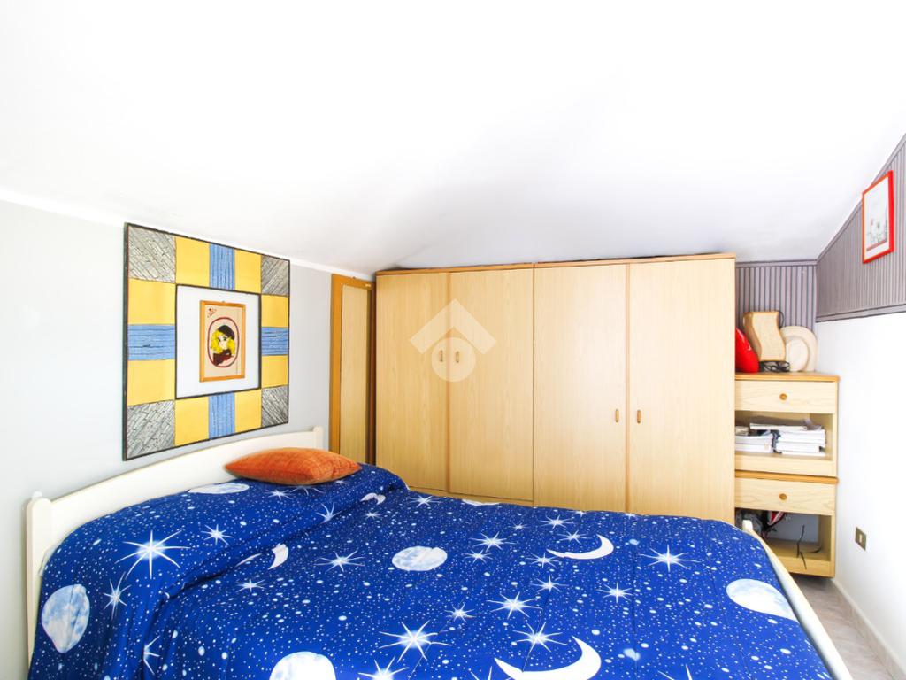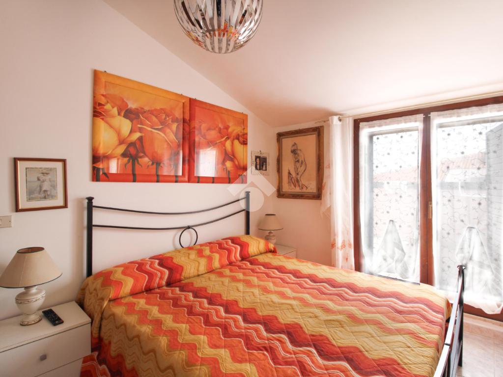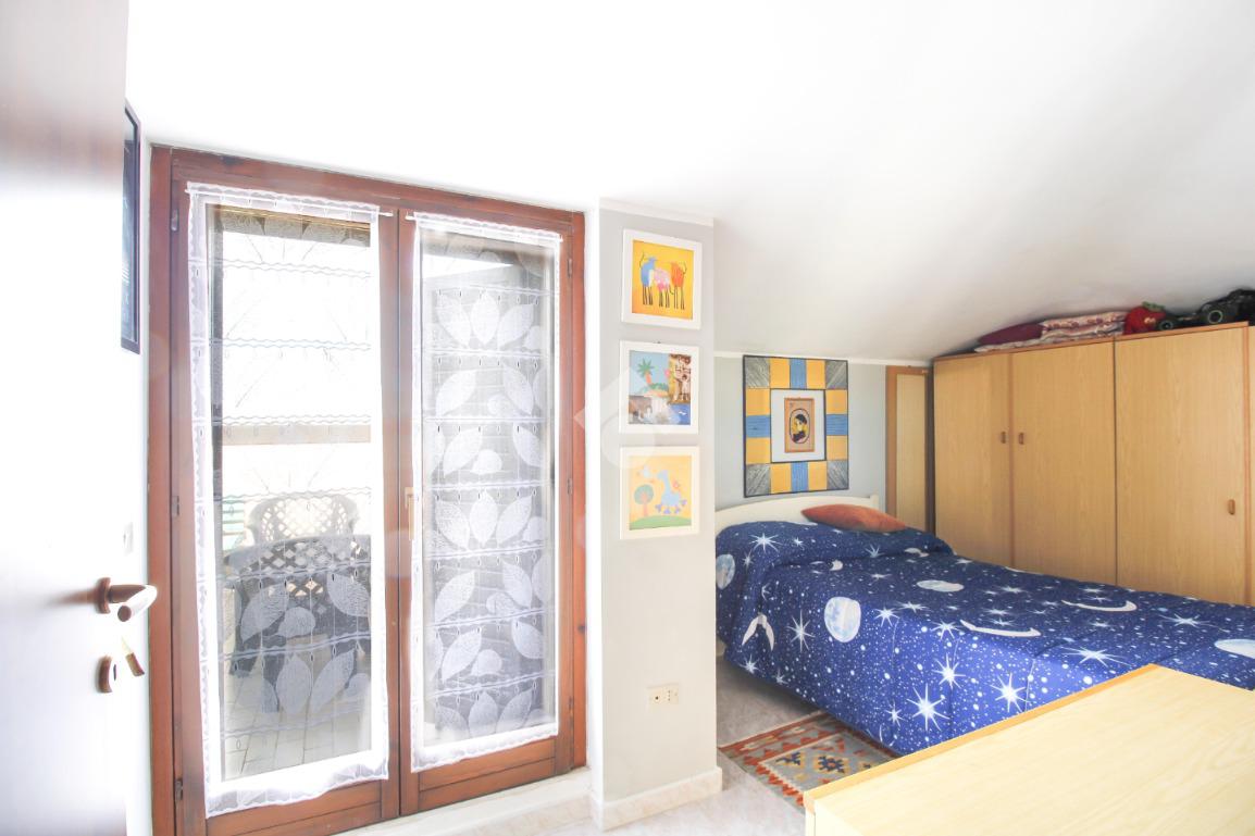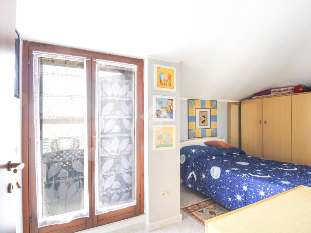 Dal disimpegno si accede alla zona notte, composta da due camere da letto: una spaziosa matrimoniale con accesso diretto al terrazzo e una cameretta con uscita sul terrazzo condiviso con il soggiorno.